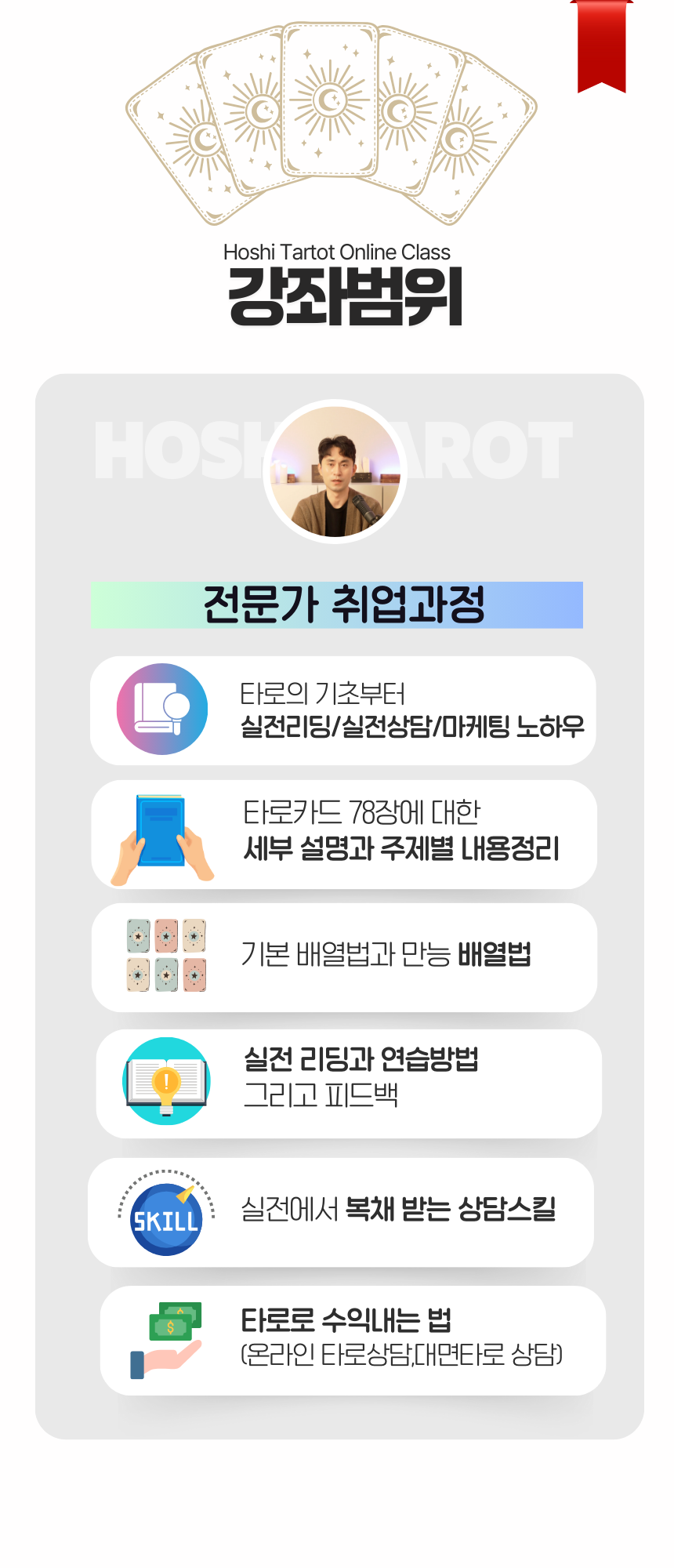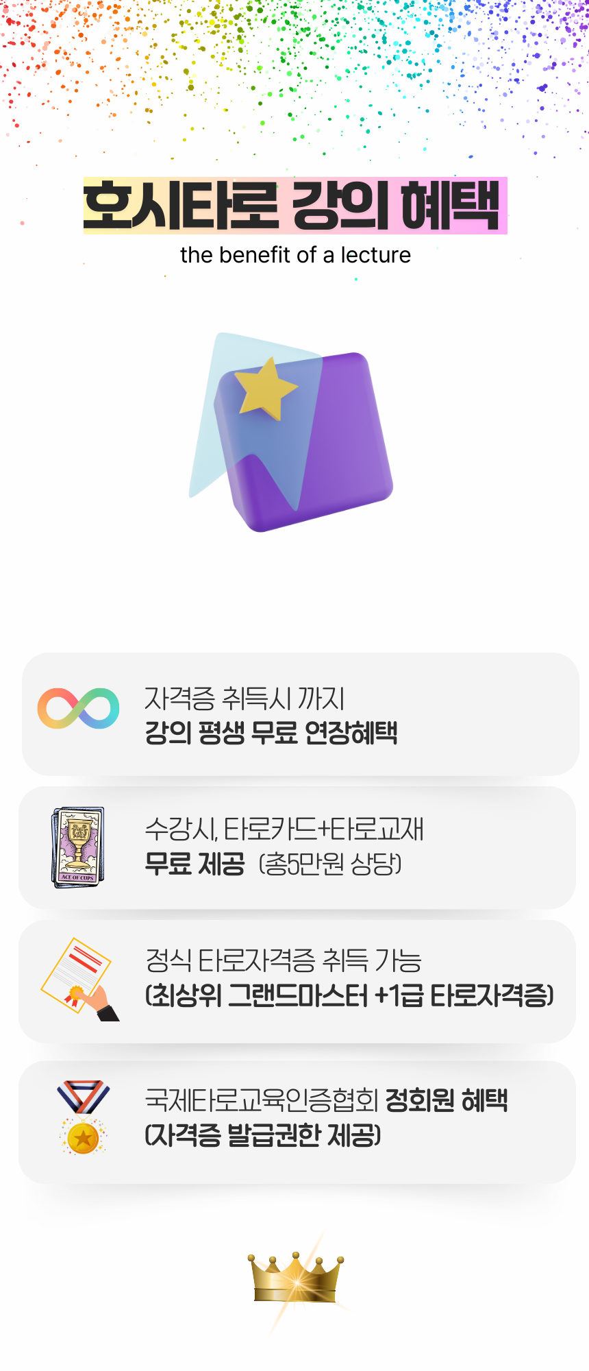 *타로자격증은 수강생 본인 명의로만 1회 발급되며, 개명시 주민등록 등본으로 본인 임을 증명을 해주셔야 합니다.